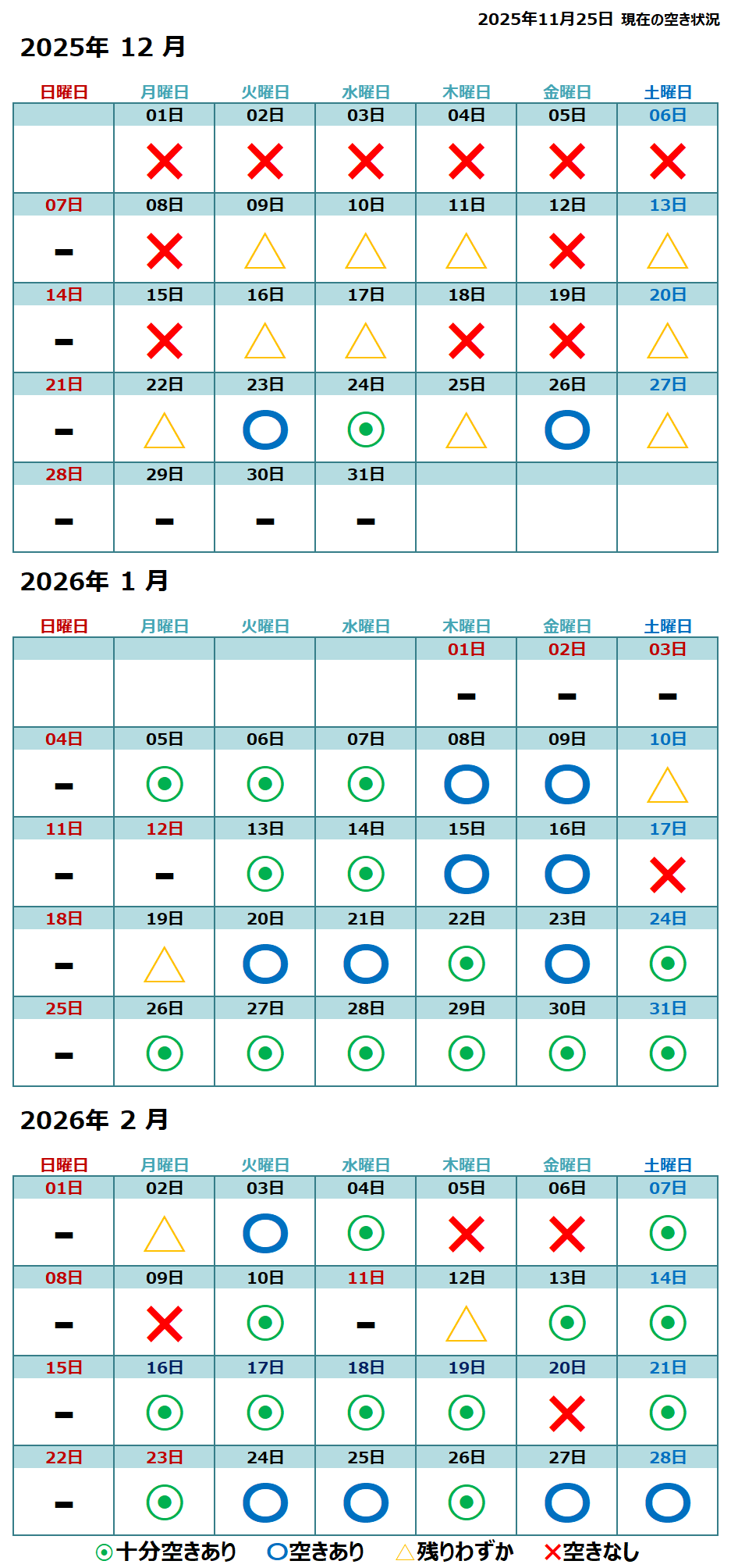 ・更新した時点での空き状況となりますので、最新状況はお電話でご確認お願いいたします。