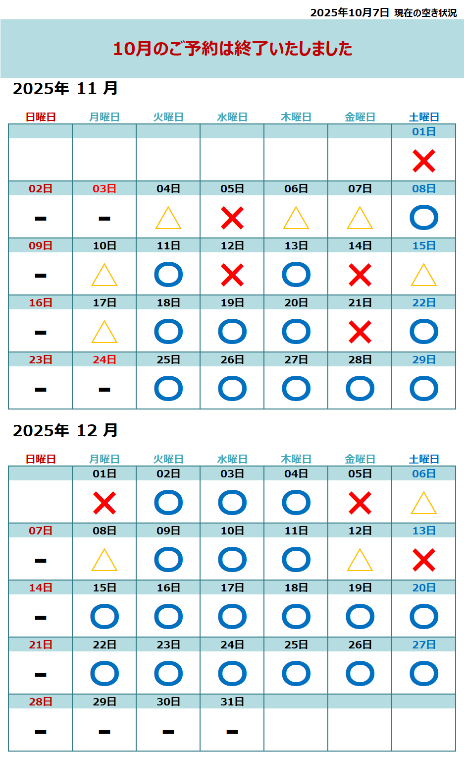 お電話で日程を決めさせていただきますが、基本的には2か月先までのご予約が可能です。