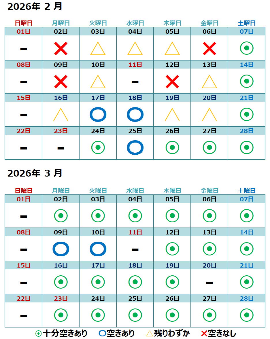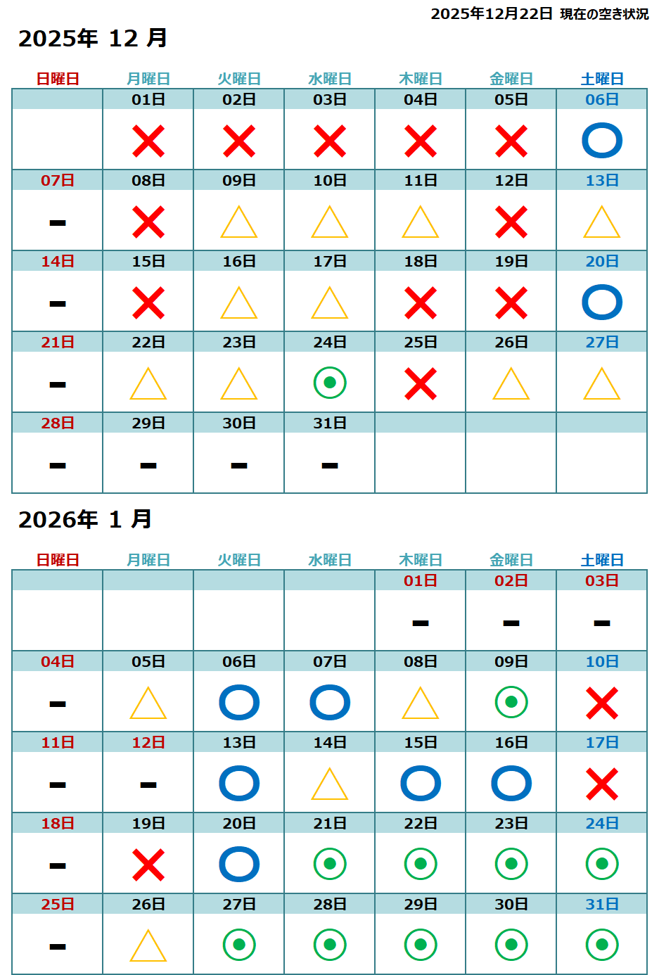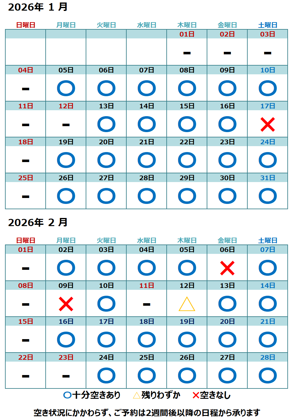 ※12月~翌年3月の閑散期につきましては随時ご予約が可能です。