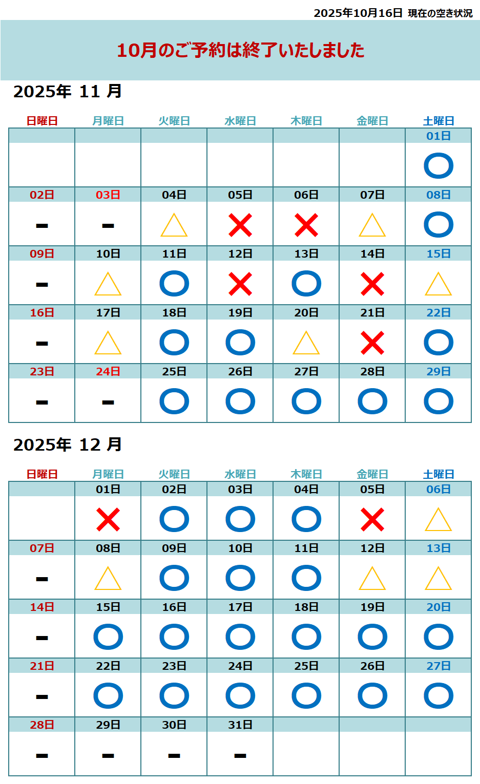 お電話で日程を決めさせていただきますが、基本的には2か月先までのご予約が可能です。