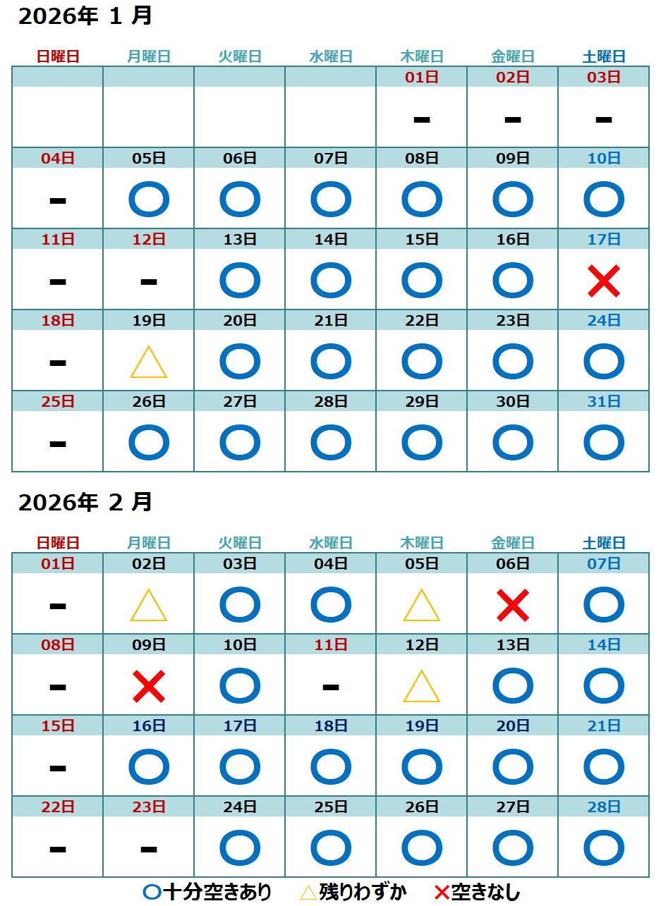 ・更新した時点での空き状況となりますので、最新状況はお電話でご確認お願いいたします。